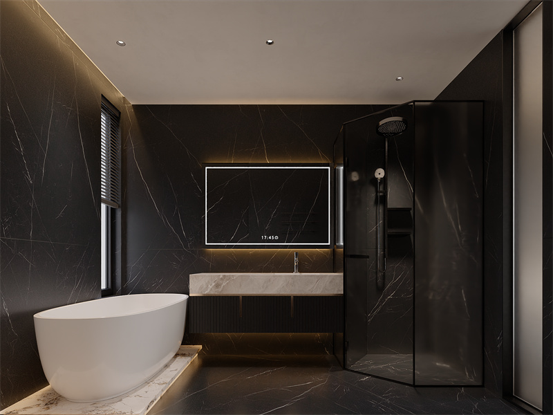 以黑灰大理石为基底,白浴缸作视觉点睛,灯光柔化冷调氛围。布局上浴缸、洗漱区、淋浴区分区清晰,适配泡澡放松的生活方式,利落线条+极简色彩搭配,既保实用功能,又让卫浴空间裹满时尚松弛的质感。