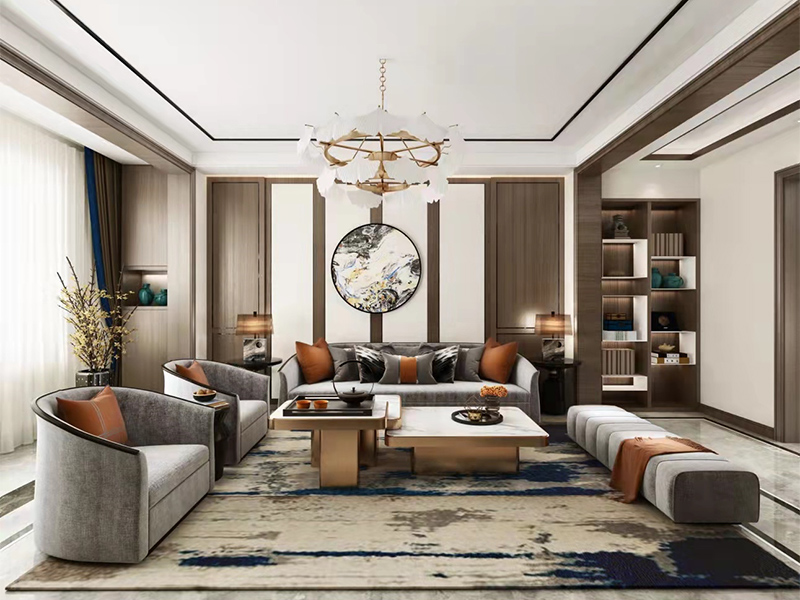 以木棕+灰调为核心,圆形装饰画添中式韵,对称布局显平衡,置物架藏收纳。适配亲友小聚的生活方式,软装色彩呼应主调,新中式的雅致与现代舒适相融,裹满松弛的日常氛围。