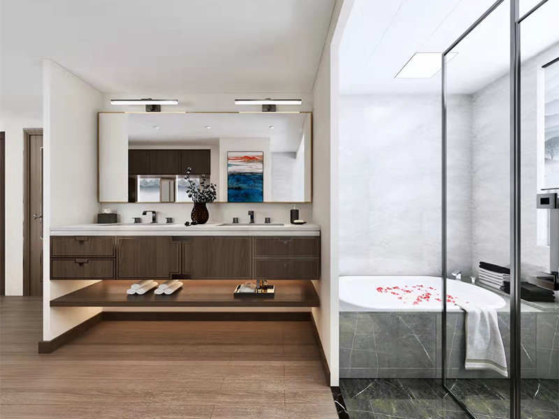 以木棕+白灰为色调,布局上洗漱区与浴缸分区清晰,嵌入式台面藏实用。装饰画添中式韵,适配泡澡放松的生活方式,木调柔化冷感,简约线条裹着雅致松弛,让卫浴空间既有新中式的韵致,又具舒适质感。