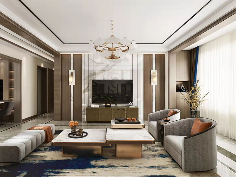 以木棕+石纹为基底,对称布局显规整,壁灯衬层次,电视柜隐收纳。色彩柔和统一,适配观影休闲的生活场景,新中式灯具与纹理嵌于简约肌理,让休闲时刻兼具雅致格调与舒适松弛。