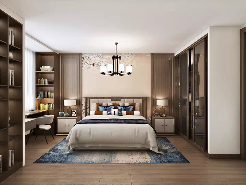 以木棕+浅米为色调,背景墙饰花鸟韵,嵌入式书柜连书桌拓功能。布局上休憩与轻办公联动,适配睡前阅读、日常办公的生活场景,色彩柔和松弛,新中式细节让私域兼具雅致格调与实用质感。